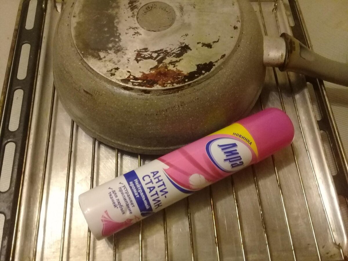 Недавно мне попался очень удивительный совет: для удаления нагара и застарелого жира со сковородок, противней, решеток для гриля нужно использовать обычный антистатик. По словам автора, стоит разбрызгать спрей по поверхности, как все загрязнения моментально будут смыты. Мне не понятно, каким образом антистатик может действовать на нагар, ведь он не содержит в своем составе ни кислот, ни щелочи, ни хлора. Ради интереса решила проверить лайфхак на эффективность. Шаг 1. Замачиваем По совету автора: Видимого эффекта нет. Шаг 2. Чистим После замачивания пригоревший жир должен был легко отмыться губкой или щеткой. Сковороду, которую я замачивала в обычном антистатике, чистила сначала обычной кухонной, потом карборундовой губкой. Эффекта ноль. Так же как на решетке и противне, для мытья которых я использовала средство для чистки оптики. Справедливости ради надо заметить, что относительно свежий жир отмылся. Решетка стала чище. Но с нагаром и застарелыми жирными следами антистатик точно не сп