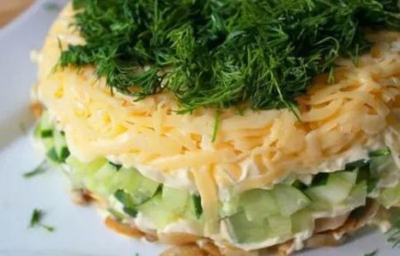 Ингредиенты: 1-й слой: мелко режем лук, смазываем майонезом. 2-й слой: сельдь чистим, режем небольшими кусочками. 3-й слой: картофель варим, трем на крупной терке, смазываем майонезом. 4-й слой: огурец режем небольшими кубиками, смазываем майонезом. 5-й слой: сыр трем на крупной терке. Сверху посыпаем мелко порезанным укропом.