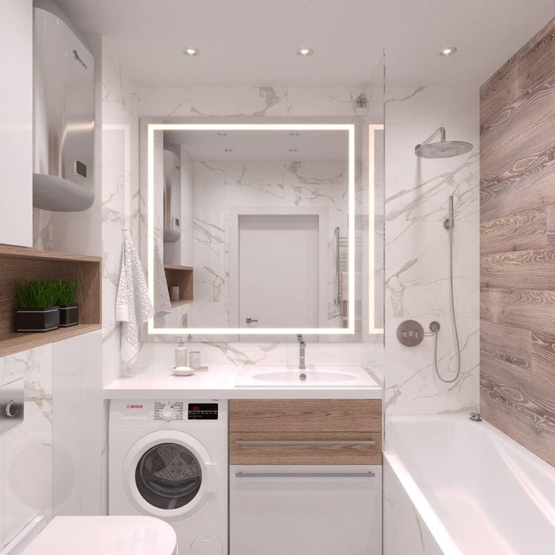 Ванные комнаты простором не отличаются и в новом, и уж тем более в старом жилфонде. А вместить в это помещение нужно многое: ванну или душевую кабину, раковину, зеркало, какой-никакой шкаф, стиральную машинку. Если санузел совмещённый — ещё и унитаз. И водонагреватель, конечно. Где разместить бойлер, чтобы он не портил дизайн ванной и не мешал? С проточными такой проблемы не возникает. Они компактные, симпатичные, закрепить на стене рядом с раковиной — проще простого. А вот накопительные — боль и печаль. Особенно если нагреватель вы покупаете и устанавливаете не во время ремонта ванной, а после, и выводы труб, а также розетки под него не предусмотрены. Получается что-то похожее на фото ниже. Воду пришлось выводить вот такими некрасивыми трубами, душевую стойку снимать, чтобы закрепить водонагреватель на стене над ванной. Почему именно здесь? Потому что, во-первых, так ближе всего, в противном случае для подключения пришлось бы ломать плиточный короб и переделывать все коммуникации. А