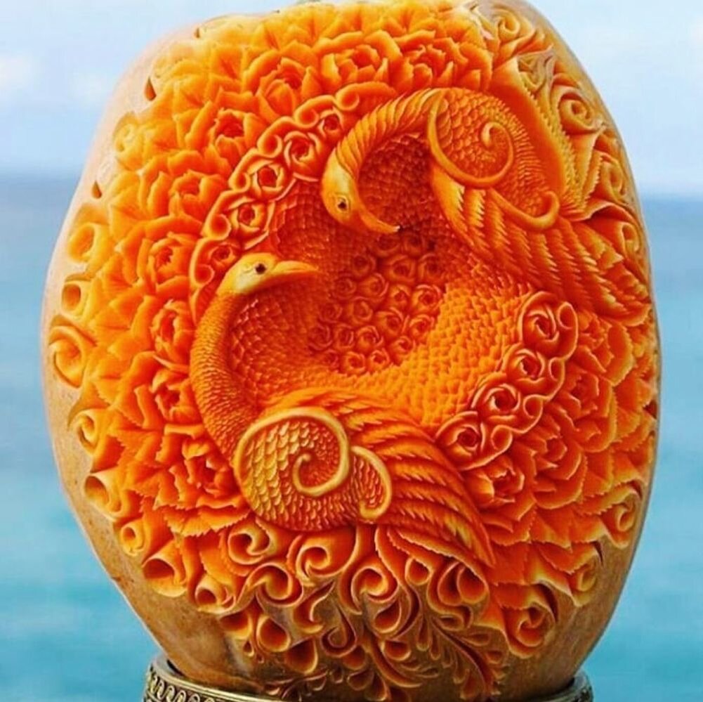 Искусство далеко не всегда вечно, особенно если холст художника – это овощи фрукты! Неудивительно, что такая идея нашла своё воплощение именно в Японии. В стране восходящего солнца художник Гаку (Gaku) работает в технике мукимоно – это вырезание различных узоров на фруктах и овощах. В распоряжении мастера только нож и несколько минут! Для рисунка Гаку обычно выбирает цветы, животных и даже персонажей мультфильмов. Сразу же после завершения работы Гаку съедает собственное произведение. В японских семьях такая диковинка используется в качестве гарнира, закуски или украшения блюд. Поэтому мукимоно можно смело назвать не просто искусством, а искусством кулинарии. Творческий путь Гаку начал с бананов, так как они легко поддаются вырезанию. Более того, они не стоят великих денег, что нельзя не считать плюсом для начинающего художника.