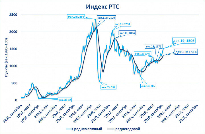 Индекс РТС лучший за семь лет. Означает ли это, что кризис закончился, толком не начавшись? В декабре среднее значение индекса РТС составило 1506 пунктов. В последний раз такое наблюдалось в марте 2013 года, почти семь лет назад. На логарифмической шкале результаты пока по-прежнему выглядят скромно. Во-первых, индексу далеко не только до исторического рекорда мая 2008 года, но и до рекорда девятилетней давности 2011 года (см. жёлтые выноски на графике). Во-вторых, легко просматриваются два периода: бурного роста до 2008 года (зелёные пунктирные линии) и колебания в горизонтальном (пусть и широком) коридоре (красные пунктирные линии). Тем не менее, повод для оптимизма есть. Темпы роста индекса с каждым месяцем всё выше. В декабре индекс был на 38% выше, чем год назад. Почему важны темпы? Они являются хорошим опережающим сигналом. Так, замедления индекса РТС (обозначенные выносками развороты синей линии в 2006, 2010 и 2017 годах) предшествовали таким кризисным явлениям, как снижение об
