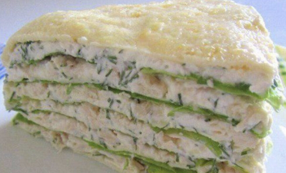 Выкладываем в форму: сначала белковый блин, на него – слой творога, курица, листья салата. Повторяем слой. Закрываем все белковым блинчиком.