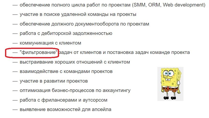 Некоторые вакансии поражают своей курьезностью. Либо работодатели троллят тех кто им пишет, либо правда такие "особенные" и им нужны такие же "особенные" люди. 3 место. Вакансия для Губки Боба Нужно уметь быть фильтром. Кто проживает на дне океана? Правильно. Вот вы и поднимайтесь оттуда уже. Пора, за работу. 2 Место. Вакансия для Илона Маска Такие вакансии всегда вызывают смех, потому что человек, который умеет все это - никогда не будет на кого то работать. Кого ищут в таких случаях не представляю. Наверное отчаянных Desperado. Илон конечно бы сразу пришел к ним, но боюсь он редко заглядывает на сайты по поиску работы. 1 Место. Вакансия для Гарри Поттера Такой троллинг от работодателя редко встретишь. Ведь пишут им наверняка в письмах это заклинание. На что они рассчитывают? Что свет прогонит дементоров из их компании? А почему там дементоры бродят без контроля? Среди Маглов! Срочно нужно написать в министерство магии! Честно, я переживаю за людей, которые откликаются на такие вака