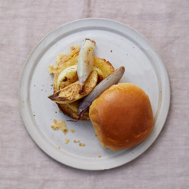 крупно молотый перец Нагрейте духовку до 220C (200C Вентилятор) / Газ 7. В небольшую форму для запекания бросьте лук-шалот с оливковым маслом и обжарьте, поворачивая один раз, в течение 30 минут или до мягкости. Выньте из духовки и поставьте духовку на гриль. В маленькой сковороде на тяжелой основе разогрейте столовую ложку сливочного масла на сильном огне до шипения. Добавьте дольки яблока и обжаривайте в течение 45-60 секунд с одной стороны, или до золотисто-коричневого цвета, но аль денте. Если яблоко загорается слишком быстро, уменьшите огонь. Разделите сыр между нижними половинками булочек. Положите бутерброды под гриль или запекайте в течение нескольких минут, пока сыр не начнет таять. Разложите яблочные дольки поверх сыра, затем отрежьте концы лу