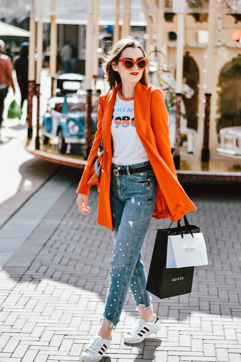 Несмотря на свою выразительность, оранжевый пиджак будет прекрасно смотреться в повседневном и деловом стиле. Он отлично гармонирует как с узкими джинсами синего, голубого, черного цветов, так и с брюками широкого покроя.