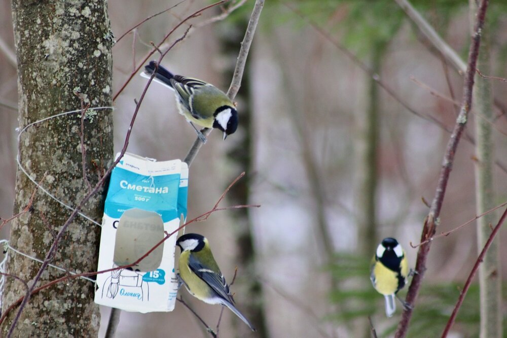 Синицы - небольшие веселые птицы с ярко-желтым окрасом (большие синицы). Зимой они стайками прилетают на птичьи кормушки к жилью человека - сорятся, мирятся, иногда дерутся, в общем проявляют все чувства, так характерные нам, людям... 1. - Ну что за люди, не могли нормальную кормушку для птиц сделать! Теперь сиди, жди своей очереди... Эй, кончай жрать, давай, освобождай место для других! 2. - Ты откуда такой чумазый? - На ближайшей помойке был, там такой закусон кто-то выбросил! Вот только в пакет с мусором забираться сложно. 3. - Скорей!!! Говорят в соседней кормушке семечки слаще! 4. - А я в домике сижу, ни на кого я не гляжу! 5. - О, никак для синиц мороженое купили! Сейчас попробую... 6. - Налетай! В птичий магазин сало завезли!!! 7. - Люблю сало! Хорошо морозной зимой сало поклевать... 8. - А ты кто такая, в нашу кормушку лезешь, наше сало ешь? - Я тоже синица! Я тоже сала хочу! Зовут меня хохлатая синица, или гренадерка. Видите, какой у меня замечательный хохолок на голове! 9.