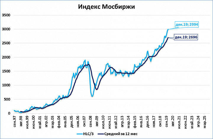 Среднее значение индекса Мосбиржи в декабре достигло 2994 пункта, что является историческим рекордом. Когда пишутся эти строки (10 января) индекс штурмует новые высоты: взята отметка 3100 пунктов. Декабрьский индекс на 27% выше, чем в декабре 2018 года. Важно: замедления индекса (последнее началось в феврале 2017 года) происходят за 1,5 – 2 года до начала падения грузоперевозок, падения на рынке легковых автомобилей, грузовиков (см. жёлтые выноски на графике). Реальный индекс Мосбиржи Выше рассмотрены номинальные значения индекса. Но если учесть инфляцию, то картина меняется. Реальный индекс Мосбиржи* пока далёк от исторических рекордов, хотя и лучший за 8 последних лет. По итогам декабря он остановился в шаге от локального максимума 2011 года. В ближайшее время этот рубеж может быть взят и индекс станет лучшим за последние 11 лет. Динамика реального индекса более чётко показывает разворотные точки, предупреждающие об ухудшении в экономике. Сейчас реальный индекс начал ускоряться и с