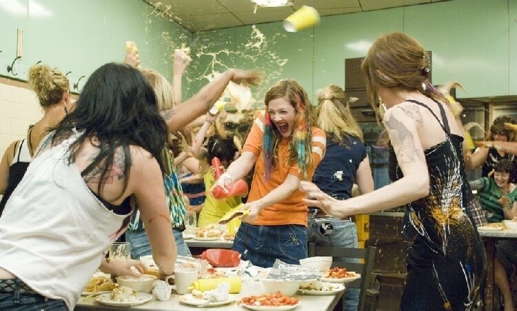 Женщина в возрасте, видно воспитывалась в советское время, начала обвинять американцев в том, что они якобы не уважают еду, кидаются ею (наверно многие видели сцены в фильмах или мультфильмах когда, они устраивают "войну едой" и кидаются едой друг в друга). Аргументируя это тем, что у них вся еда химия и они не берегут её.
