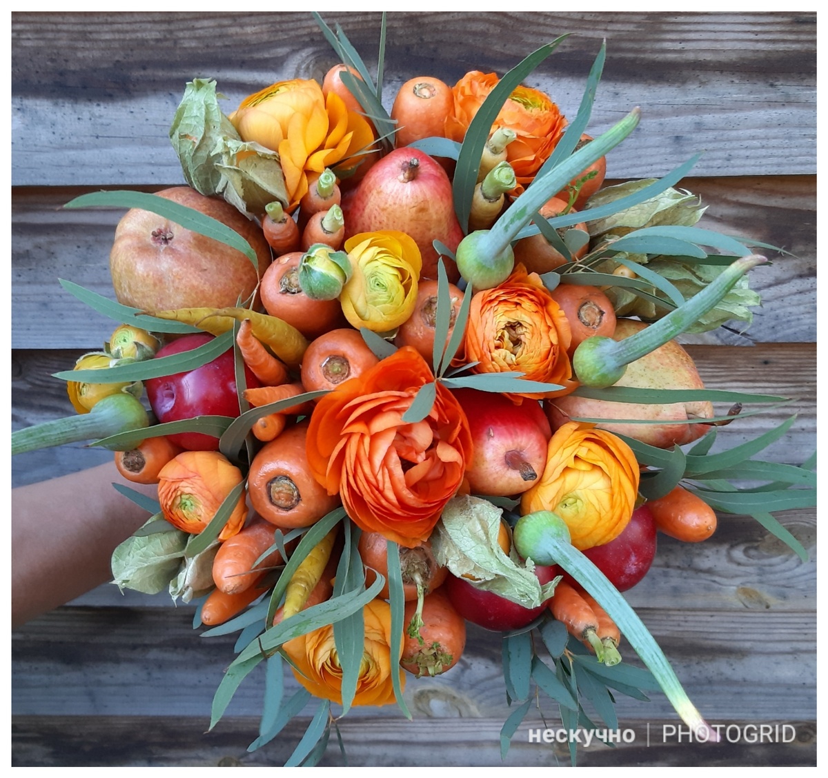 Продолжим вести беседу про то, что букеты из овощей и фруктов - это искусство. Лично для меня, они не про еду, хотя конечно, там вкусные и свежие овощи и фрукты. Их можно и нужно есть прямо из букета или приготовить из них что-нибудь вкусненькое. До того, как началась моя букетная жизнь, я как и все смотрела на овощи и фрукты, как на гарнир или что-нибудь вкусненькое. Теперь посещения продуктового для меня почти как сходить в музей ))) Ну не так, конечно, но все же. Я рассматриваю их, ищу идеальные или наоборот с какой-нибудь "изюминкой". В общем мир мой теперь другой. Таким букетом можно передать любое настроение, можно сделать букет, который говорит об определенных чувствах, можно сделать букет даже по мотивам произведения или картины. Я надеюсь, вы убедитесь в этом, я постараюсь помочь.