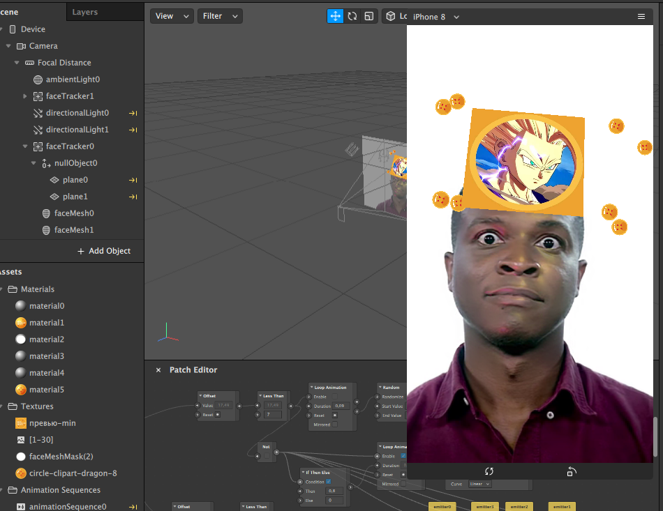 Для начала нам нужно определиться с какой тематикой мы будем делать маску, после чего, делаем рамку в фотошопе. Туда же мы добавляем текст, для нашего превью. И туда же мы добавляем наши картинки которые нашли в интернете!) Заходим в Spark AR, создаем новый проект и импортируем все наши картинки туда. Выделяем все картинки, кроме превью, и справа в меню находим Type: single Texture, и меняем на Texture Sequence. Далее спускаемся вниз, и видим Manual Compression, и жмем на галочку! Создаем FaceTracker, nullObject, и два plane В plane0 мы загружаем материал, и выбираем создать анимацию. И в самой анимации, выбираем наши картинки которые мы выделяли [1-30] (Все зависит от того сколько картинок вы добавили, в моем случае их 30 штук) Ставим галочку на Randomize, и выставляем 10 FPS(Это скорость прокрутки случайных картинок) Теперь заходим в патч едитор, и делаем примерно так: Нажимаем пкм, создаем runtime, дальше проводим линию и создаем offset, от него так же проводим линию и создаем L