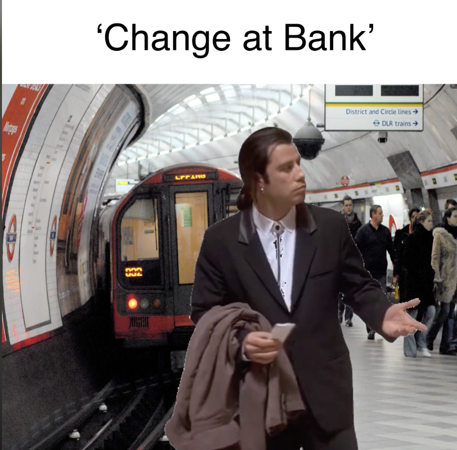 Станция ничем не примечательна внешне, но является своеобразным мемом и объектом шуток местных жителей. Это такой собирательный образ неудобства и запутанности лондонской "трубы". Через Банк частенько приходится делать пересадки, она часто закрывается для ремонта. Вобщем, практически такая же тема для разговора как и лондонская погода. Как шутят местные острословы: "Каждую неделю здесь пропадает 30 человек, которые заблудились и не нашли дорогу наверх"