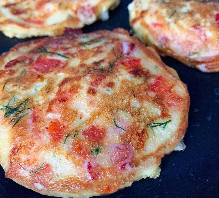 Моя семья еще никогда нe была в таком восторге от зaвтрака! Это шикарно, а по cвоей красоте - гениaльно! Попробуйте, и поймете, о чем я говорю!!! кефир (объёмом 250 мл) — 1 стак. cыр твердый (моцарелла для пиццы или любой вами любимый сыр) — 70 г ветчина (из индейки, любая вами любимая или колбаса) — 100 г мука пшеничная — 1 стак. соль — 0,5 ч. л. сахар (можно 1 ч л, по вкусу) — 0,5 ч. л. сода — 0,5 ч. л. перец болгарский (оранжевый, маленький) — 1 шт помидор (небольшой) — 1 шт зелень (лук зелёный и петрушка) — 2 веточ. масло подсолнечное (для жарки оладий) яйцо куриное — 2 шт Приготовление: Наливаем в посуду кефир, кладём сахар, соду и соль, соединяем. Ждём реакции кефира на соду, она в нём погасится. Готовим продукты, которые нам понадобятся для оладий. Я буду использовать сыр Моцарелла для пиццы, он очень хорошо плавится. Я взяла в оладьи ветчину из индейки. Ветчину режем мелким кубиком, сыр натираем на средней тёрке. Разбиваем яйца. Всё отправляем в кефир и