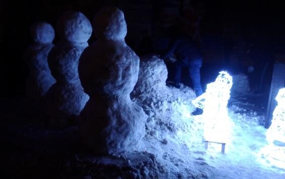 На площади перед драматическим театром имени А. С. Пушкина достаточно интенсивный субботний снегопад позволил дополнить и без того уникальную пока для Курска композицию из светомузыкальной ели, неонового фонтана и светодиодных фигур с приёмной Деда Мороза по соседству - парадом снеговиков.