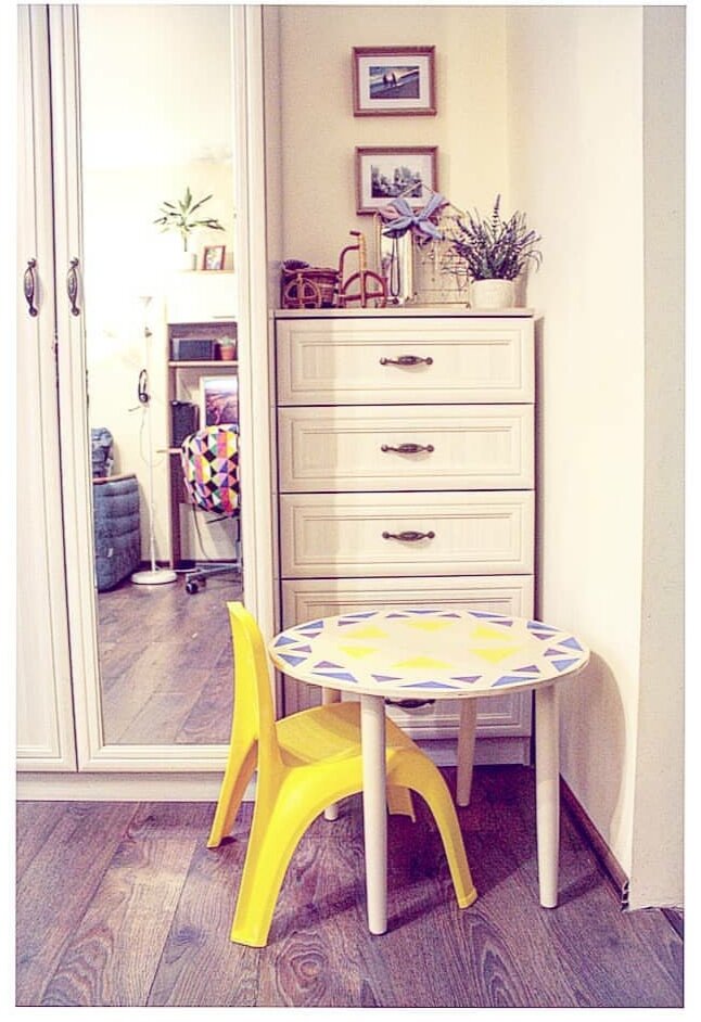 Купила ножки, крепления для них и фанеру для распила в Леруа. 🔹Вырезала лобзиком из листа фанеры круг. Долго думала, как нарисовать идеально ровный круг. Способ с карандашом и ниткой отмела (не самый идеальный вариант из-за моих кривых рук). Хотелось просто что-то положить сверху на фанеру и обвести карандашом. Даже пошла купить таз нужного диаметра... В итоге осознала, что у нас дома уже стоит один круглый стол... 🤦 Его я и использовала, как трафарет. Если вы знаете иной способ, как нарисовать ровный круг на фанере (может даже креативный, забавный и смешной), пишите в комментариях. С удовольствием почитаю! Первая работа с лобзиком, и почти круг получился! Исправляем.. 🔹Шлифуем столешницу мелким зерном (Р120). 🔹Наносим грунтовку. 🔹Прикручиваем ножки. 🔹Красим стол вместе с ножками эмалью цвета слоновой кости. 🔹С помощью малярного скотча, от края к центру формируем треугольники и закрашиваем разными цветами. Как вы понимаете, дизайн столика может быть каким угодно (по форме, цв