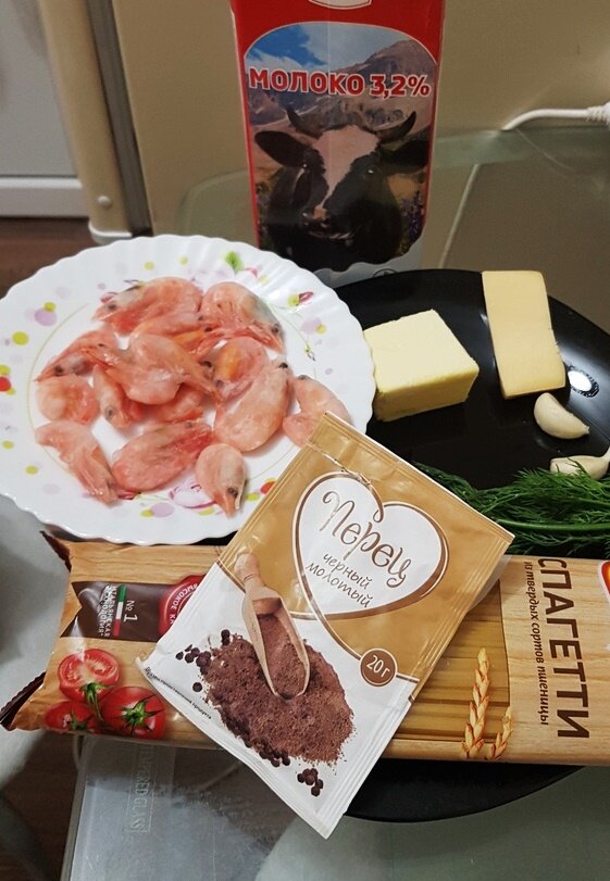 Приветствую всех, кто любит вкусно готовить и поесть! Сегодня хочу рассказать о потрясающем рецепте креветок со сливками. Лично мне очень понравилось и буду повторять снова. Готовила первый раз и вышло все удачно, и конечно же не без ошибок. Купила замороженные креветки. Первая ошибка - это я повелась на цену, креветки оказались мелкими. Вторая ошибка - приготовила не почистив. Конечно так можно готовить, но советую лучше удалить панцир и внутренности. Несмотря на все это, вышло все великолепно вкусно. Просто пришлось чистить креветки во время трапезы. Креветки подавала вместе со спагетти. Список ингредиентов: Креветки - 300 г. Масло сливочное – 100 г. Сливки или Молоко – 150 мл. Чеснок - 2 зубчика. Перец - 0,5 чайн. ложки Зелень Соль по вкусу Спагетти - 200 г. Сыр по желанию Подготовим ингредиенты. Креветки размораживаем и очищаем от панциря и внутренностей. Измельчим чеснок и зелень. Паралельно ставим кипятить воду для спагетти. Приятного аппетита! Если понравился рецепт, прошу
