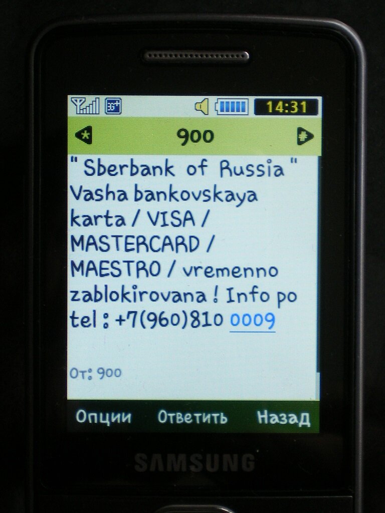 Сейчас существует множество схем развода держателей банковских карт. Сегодня я расскажу про три самые популярные. и как на них не попасться . Блокировка карты Клиент банка получает сообщение "Ваша карта будет заблокирована". Также в сообщение говорится, что нужно обратится по номеру телефона из SMS-сообщения, чтобы избежать блокировки карты. При звонке по указанному номеру, человеку сообщают, что его карта действительно заблокирована и для решения проблемы надо сверить данные карты. Таким образом жертва сама выдает всю информацию: номер карты, срок действия и CVV-код. Если вам вдруг пришла такая SMSка, то лучше обратиться в отделение банка или позвонить в банк по телефону, указанному на официальном сайте (сайт находим в интернете!). Неожиданный перевод от неизвестного отправителя Жертве поступает SMS-уведомление о поступлении денежного перевода. В сообщении также указано, что деньги заморожены и чтобы их разблокировать - нужно позвонить по номеру из сообщения. Дальше все по тако