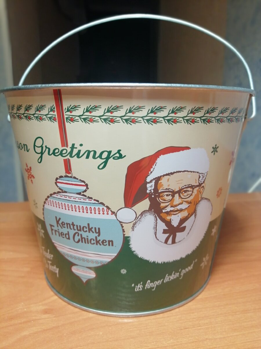 Добрый день, в этой статье расскажу свой маленький секрет, как мы экономим с каждого похода в KFC по 119 рублей с заказа на 14 крыльев. Примерно 3 раза в месяц мы заглядываем в ресторан KFC. Часто берём баскет в котором 14 крыльев называется он баскет размера S и стоит он сам по себе 400 рублей, если быть точным то 399 рублей, но если вы покупаете вот такое ведро за 100 рублей один раз, то получаете скидку на весь год в размере 30% Это металлическое, классное новогоднее ведро с индивидуальным дизайном на котором изображён конечно же главный символ KFC это полковник Сандерс! Дизайн на самом деле за целый год не поменялся потому, что то в прошлом году выходили такие же, именно с таким же дизайном ведра. Все ждали что будет возможно какой-то свежий дизайн, но этого не произошло и мы получили те же самые ведра. Ну и ладно, как бы скидка 30% на 2020 год на дороге не валяется! Обязательное условие участия в этой акции вы с этим ведром должны ходить в KFC. И тогда вам будут применять ку