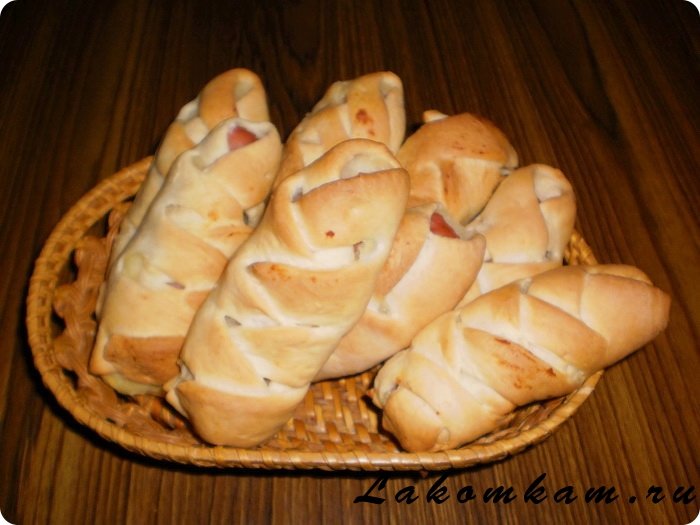 Ингредиенты: молоко — 250 миллилитров; соль — половина чайной ложки; сахар — 2 столовые ложки; сухие дрожжи — 2 чайные ложки; маргарин — 100 грамм; пшеничная мука — 500 грамм. Для начинки: сосиски — 10-15 штук; картофельное пюре — 300 грамм.