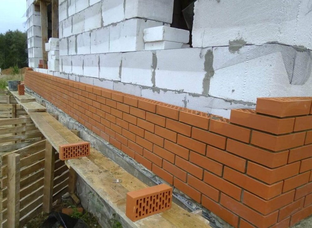 Материалом для цоколя может служить тот же кирпич. Понятно, что выложить все целыми кирпичами не получится, все равно придется ломать на половинки. Чем таких половинок меньше, тем экономичнее используется