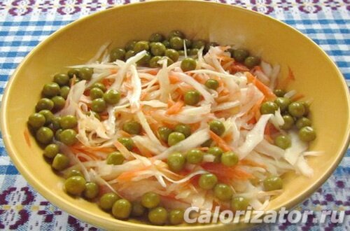 Добавить к капусте и моркови зеленый горошек, выдавить чеснок перемешать, Добавить две ложки майонеза, соль все перемешать и подавать к столу, можно сочетать с гарниром, можно есть с хлебом, можно украсить зеленью для аромата, кто как любит. Приятного аппетита!