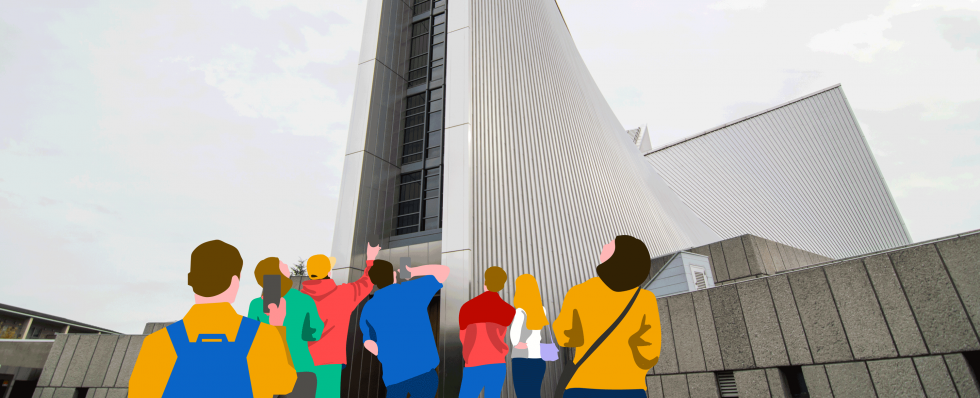 Форма собора — католический крест, который можно целиком охватить взглядом, только поднявшись на соседний пешеходный мост. Способность японцев наслаждаться прекрасным в его первозданном виде здесь налицо. Ты увидишь металлическую облицовку фасадов и строгость необработанного бетона в интерьере. Как это часто бывает с объектами знаковой архитектуры, здание работает как сообщение.