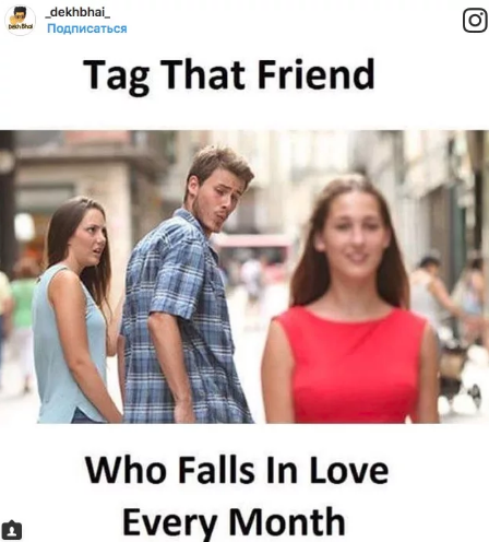 Это фото было сделано в 2015 г. на одной из фотосессий в Испании фотографом Антонио Гийем. Главного героя этого мема зовут Марио, а его девушку - Лаурой. Они работали в одном фотоагентстве. Никакого задуманного сценария не было, модели импровизировали. Вообще эта работа задумывалась как полноценная история, о том как люди учащиеся в одном университете. В итоге парень собирается сделать предложение девушке, что в итоге приводит к рождению ребёнка. Ребёнок заболел, и муж сразу после первых проблем в семье изменяет жене. Девушка требует развод. Данную фотографию очень сильно распространяли по соц. сетям. Пользователи Твиттера поменяли главный мем этим, самые успешные твиты с этим мемом набирали тысячи твитов. Также пользователь инстаграмма @dekhbhai ( у которого более 2 миллиона подписок) опубликовал эту картинку со словами: Отметь друга, который влюбляется каждый месяц. Вскоре, в российском ВК стал появляться этот мем, а к январю этот мем окончательно добрался до России. Различные ва