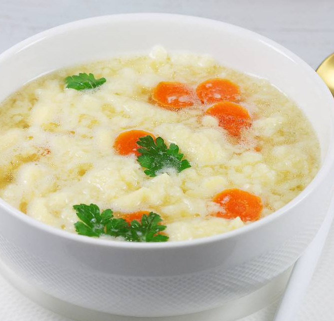 Блюдо готовится буквально за 5 минут, при условии, что уже имеется готовый куриный или овощной бульон. Лапшу можно готовить в качестве первого блюда или в виде молочного супа. Ингредиенты 800 мл бульона на ваш вкус 2 яйца 30 гр. кефира 50 гр. муки Щепотка соли Приготовление Муку пересыплем в миску, вобьем яйца, добавим кефир, посолим, взобьем вилкой или погружным миксером до однородной слегка пузырящейся массы. Тесто по консистенции должно получиться чуть более густым, нежели блинное. В кастрюлю выльем бульон, доведем до кипения и тонкой струйкой вольём тесто, не мешаем до тех пор, пока лапша не станет объемной и воздушной, аккуратно перемешаем, проварим не более минуты, снимем с огня и оставим на 10-15 минут. Перед подачей, по желанию посыплем рубленой зеленью. Если вы хотите приготовить молочный суп, то вместо бульона вскипятим молоко, затем вольем лапшу, а в само тесто добавим ложку сахара и каплю ванили. Приятного аппетита! Информация ниже, наверняка будет для вас интересной