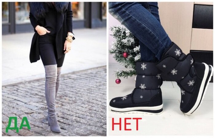 Мунбуты, лунаходы, дутики…У этой обуви есть множество различных названий, но суть от этого не меняется. Они представляют собой сапоги или полуботинки в спортивном стиле. Если говорить о детском гардеробе, то там они на вершине популярности. Но вот взрослым девушкам лучше отдать предпочтение чему-то более красивому, женственному и утонченному. Да, они удобные, практичные, теплые, но абсолютно не универсальные, а это качество очень важно для зимы. Ими можно дополнить только спортивный образ, а вот если вы захотите надеть платье и зимнее пальто, то мунбуты явно не впишутся в этот look. Да и в стиле кэжуал они будут смотреться не совсем уместно. Замените их сапогами с широким голенищем или ботинками в ковбойском стиле. Это будет намного гармоничнее.