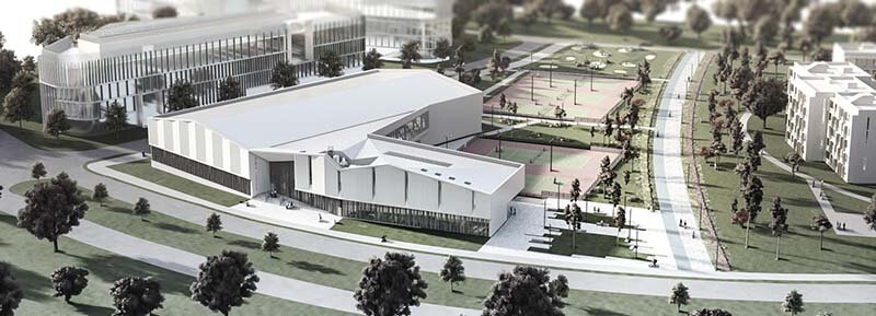 По задумке архитекторов, для того чтобы функция комплекса безошибочно считывалась, первые этажи, включая зоны кортов, решены в стекле, что также позволяет сделать территорию вдоль комплекса комфортнее и безопаснее. Такое решение поддерживает ощущение открытости, транслирует базовые ценности и характеристики, заложенные в Сколково.