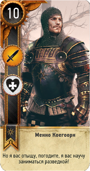 В "Ведьмак 3: Дикая Охота" одним из развлечений является перекочевавшая из книг краснолюдская игра "Гвинт". Она является любимой игрой всех , от бедного рыбака, до придворных королей. Как известно, на карточках нарисованы герои. Но не все они известны игрокам, не читавшим книг. Разберем несколько примеров из колоды Нильфгаарда: Мэнно Коегоорн Мэнно был талантливейшим полководцем и харизматичным лидером, слугой императору и отцом солдатам. Под его командованием имперские легионы не знали поражений, а противники Нильфгаарда трепетали перед одним только именем прославленного маршала Коегоорна. Он отличался также выдержкой, мужеством, человечностью, дальновидностью, честностью, тактичностью и личной храбростью, которую демонстрировал в присутствии своих людей и в бою, чем завоевывал еще больший авторитет. В решающей битве при Бренне во время Второй Северной Войны. Проигрывающий сражение Мэнно не хотел отступать, но его союзники вынудили это сделать. Обменявшись плащами с ротмистром