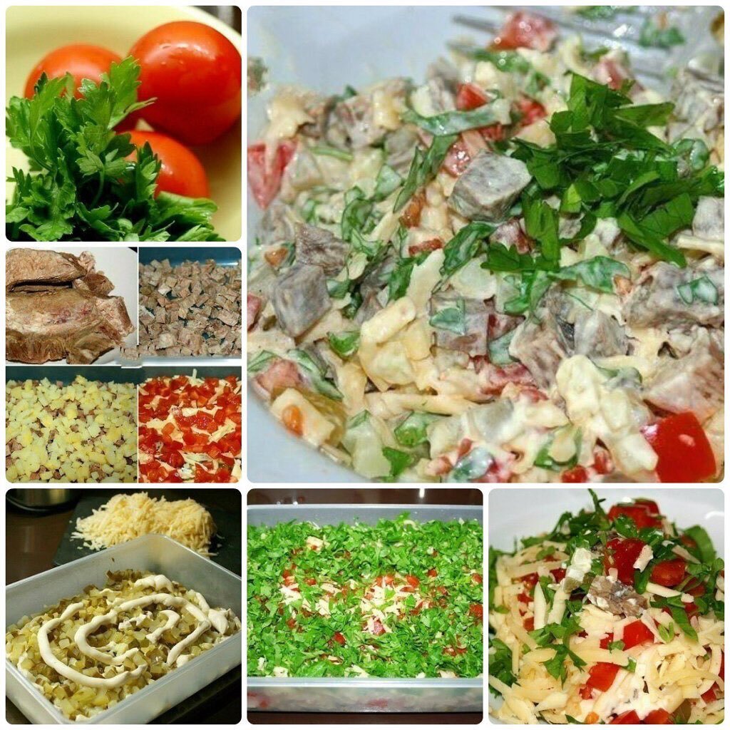 Говядину варить в подсоленной воде 1,5-2 часа чтобы была мягкой. Картофель отварить. Всё нарезаем кубиками и выкладываем слоями: говядину, картофель, соль, перец, майонез, огурцы, сыр, майонез, помидоры, соль, перец, майонез, немного сыра и рубленная петрушка! Можно, собственно, в любом порядке! Или даже сразу смешать, если есть салат собираетесь сразу