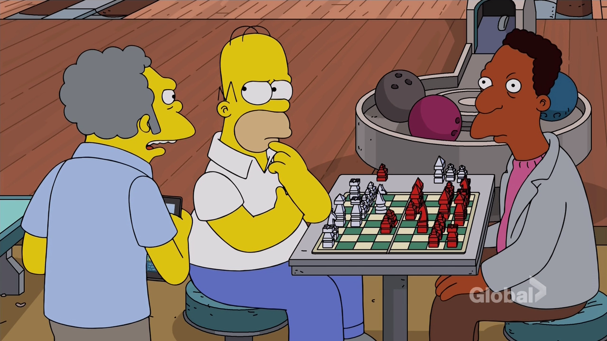 В 15 серии 28 сезона культового мульт сериала Симпсоны показали на сколько вертуозно Гомер умеет играть в шахмат. С начала Гомер даёт сеанс одновременно игры в баре побеждая все партии после чего начинает игру со своим отцом. И вот наполненный гневом за поражения которые в детстве нанёс ему отец Гомер садится за шахматную доску и властвует на шахматной доске и вот Гомер находит финальную комбинацию его отец это понимает и его охватывает ужас Гомер видя страдания отца решает сдать столь красивую партию.