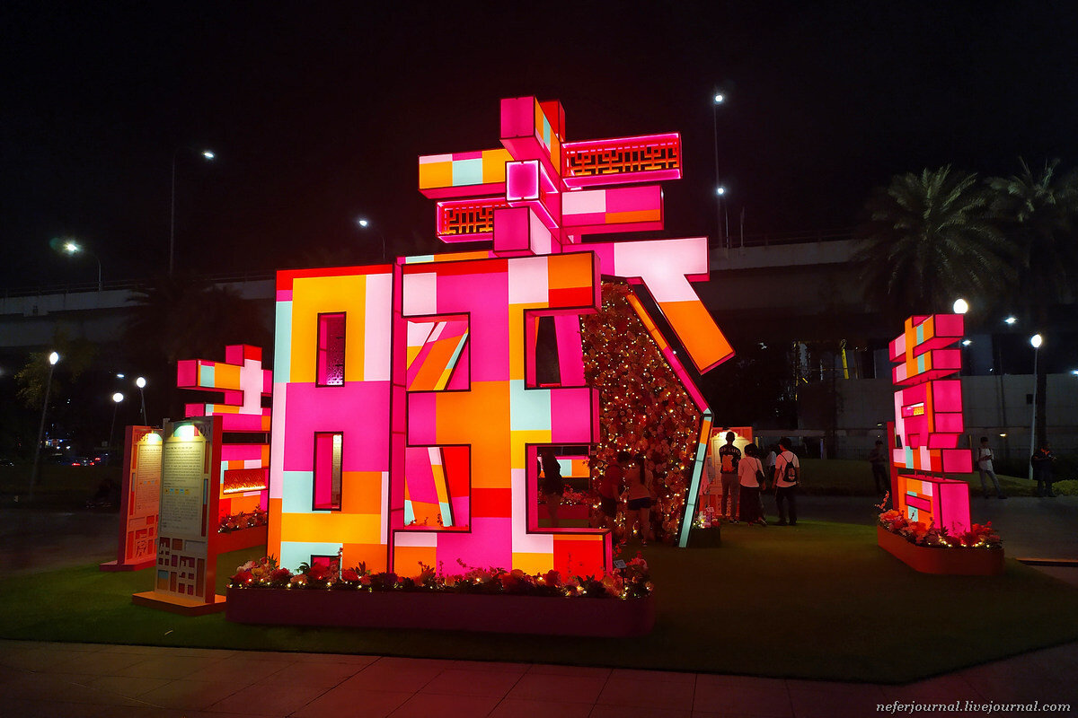 Надо сказать, что большая часть населения Сингапура - китайцы. Поэтому Новый год 1 января - праздник второстепенный. Да, улицы украшены, в новогоднюю ночь был фейерверк, но к вечеру уже начали разбирать елки. Другое дело китайский новый год. Около каждого торгового центра гигантская инсталляция. Обязательно написано про всех животных, которые являются талисманами 12-летнего цикла. Здесь вот фотозона в виде светящихся иероглифов. Что означает, не знаю, я не сильна в китайском. Внутри цветы, люди заходят, фотографируются. В торговых центрах новогодние базары. Продают товары, которые имеют символическое значение и просто разные вкусности.