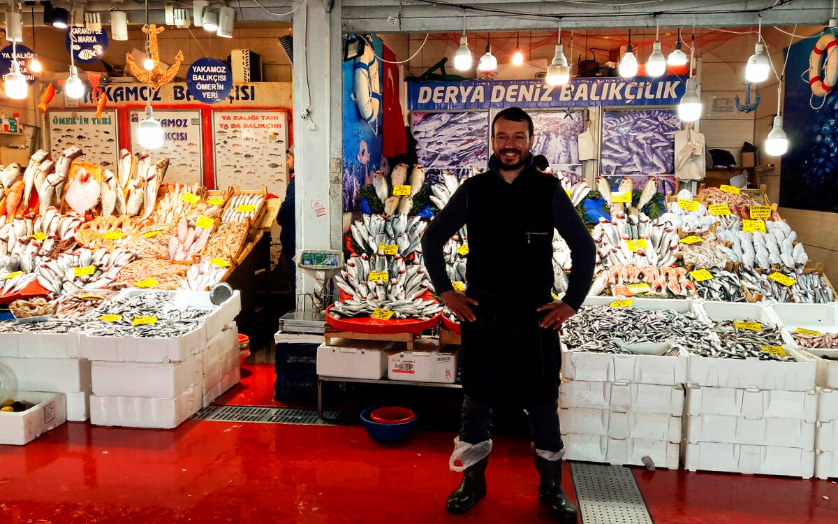 В моем детстве мясо было трудно купить, а вот с рыбой все было гораздо проще и доступнее. И до недавнего времени рыба в моем рационе занимала одно из главных блюд. Но за последние несколько лет цены на нее сильно выросли и теперь, к сожалению, рыбу мы можем позволить себе только по особым случаям. Но в некоторых странах рыба пока еще остается повседневной пищей. И в нашем путешествии по Турции мы старались восполнить в организме недостаток рыбы и других морских гадов) На один из рыбных рынков в Стамбуле мы наткнулись случайно. Находится он в самом туристическом месте города, у подножья Галатского моста, район Каракёй, на набережной со стороны Галатской башни. Как и на любой другой рынок сюда надо приходить рано утро. Но мы здесь был ближе к обеду. Задачи купить рыбу не было, а чтобы посмотреть, поговорить с продавцами и пофотографировать время правильное. Покупателей уже гораздо меньше и товар еще не весь распродан. Ближе к закрытию цены на рыбу значительно снижаются, так как она с