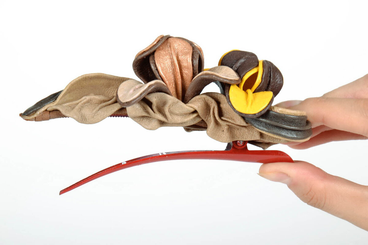 Если вам надоели однообразные прически, заколки и зажимы, а впереди вас ждет например: свидание, на котором вы хотите выглядеть необычно и сногсшибательно, тогда рекомендуем достать из запылившегося сундука ненужные материалы (желательно из кожи), включить свою фантазию, и, последовав нашему мастер-классу, выполнить красивый, декоративный цветок для волос. Для выполнения потребуются заготовки из кожи или кожзаменителя сочетаемых цветов, которые всегда можно вырезать из многочисленных, отслуживших свой век, имеющихся у нас вещей. Приступаем работе Приступая к изготовлению цветка, выполним выкройку из бумаги. Диаметры его круга выбираете сами, в зависимости от того, какого размера цветок вы хотите создать. В результате у вас получится великолепный аксессуар для волос сделанный своими руками, который отлично украсит ваши волосы, если, к тому же, подобрать цвета для выполнения под тон вашего наряда. Стоит отметить, что такой цветок можно использовать для декорации сумок, ваз, кашпо, дива