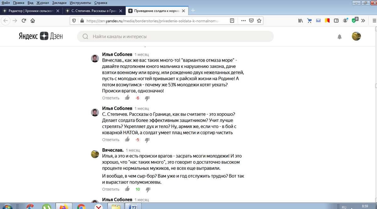 Заметьте, я не называю их глупыми или недалекими, просто по тому, что написал их очередной представитель «диванного спецназа», даже самую малость незнакомый с армейскими буднями. Армия это мужской коллектив(в основном), естественно со своими ценностями и нормами поведения. Где ты стоишь ровно столько, сколько есть на самом деле. А где не так? У вас в офисе? Не надо ля-ля! В любом коллективе есть лидеры, и есть отщепенцы. Про низкий культурный уровень даже говорить не хочется, считаю это оскорблением военных. Как минимум средняя школа или средне-специальное образование, да и высшее(порой незаконченное) не редкость. И всех этих людей скопом записать в «индивидуумы с низким культурным уровнем»? А для «идиотов» есть сержанты и офицеры. На моей памяти коллектив прессовал только стукачей и тех, кто воровал у своих товарищей.