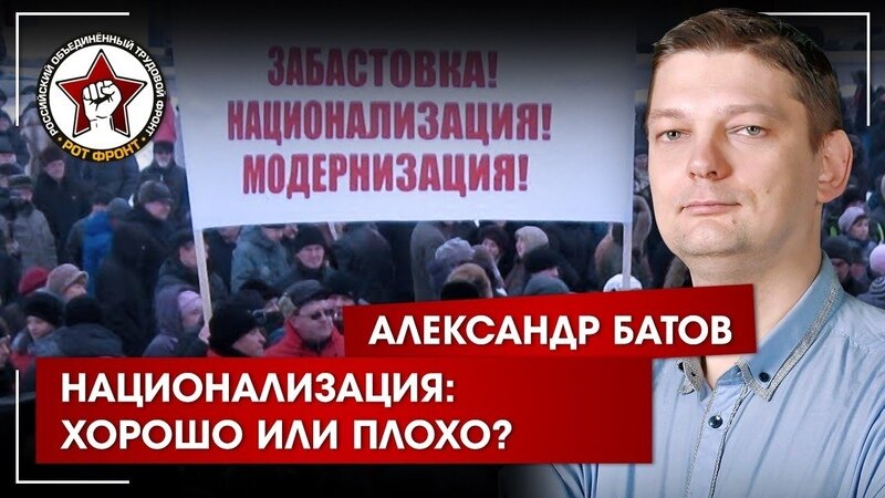 В видеорубрике сайта интересный гость: с нами снова Александр Сергеевич Батов — один из руководителей РКРП и РОТ ФРОНТа. Об Александре, как и о партиях РКРП и РОТ ФРОНТ, в которых он состоит, сайт уже рассказывал тут, тут и тут. И сегодня Александр Батов расскажет нам о том, что представляет собой национализация собственности при капитализме.