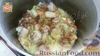 Наливаем кипяток, чтобы вода покрывала мясо. Кладем головку чеснока, очищенную и промытую. Тушим зирвак (подливу) на среднем огне, до готовности мяса (для курицы – хватит 25-30 минут). Промываем рис до чистой воды, раскладываем поверх мяса и доливаем кипятка, примерно на 1 см выше риса. Плотно закрываем крышку, готовим 20 минут. Рассыпчатый плов с ку