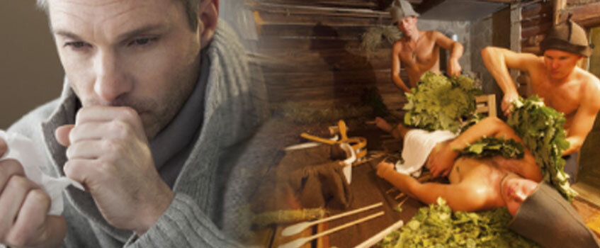 Высокая температура и горячий пар оказывают серьёзное воздействие на органы дыхания ингаляционным путём и глубоким прогреванием. При использовании веника добавляется ещё и массажный эффект. Всё вкупе позволяет довольно успешно бороться с такими явлениями как насморк, влажный и сухой кашель. Однако нужно быть точно уверенным, что недомогание не связано с серьёзными воспалительными процессами, как, например, пневмония или гнойный гайморит. При любых воспалениях, как мы уже отмечали, баня противопоказана! В парилке дыхание человека учащается, что связано с низким содержанием кислорода. Поэтому, даже абсолютно здоровый человек вдруг начинает чихать, или неожиданно ощущает насморк. Это защитная реакция организма и слизистой носа на резкое изменение температуры. Обычно это явление проходит через пару минут, по мере адаптации организма. Но оно подсказывает нам, что прогрев лучше осуществлять постепенно: -войдя в парную, задержитесь у двери на десяток секунд, -затем присядьте на минут