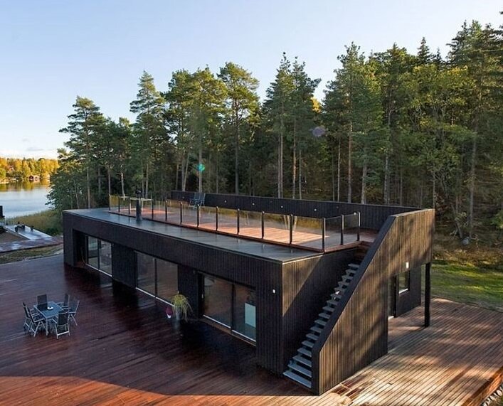 Многие задаются вопросом строительства загородного домика по доступной цене и быстро. Предлагаем вашему вниманию подборку фотографий домов построенных из морских контейнеров. Данный вид строительства весьма доступен, и что немаловажно Вы практически сразу получаете готовое изделие т.е. пол потолок и стены. В зависимости от места проживания конечно, можно исключить такой параметр как заливка фундамента, но это конечно сугубо индивидуально все зависит от почвы где Вы будите строить свой дом. Строительство домов из морских контейнеров это своего рода конструктор «детские кубики» как Вы их выстроите таким дом и будет. Далее намечаете где у Вас будут окна и двери. Снаружи можно обойтись простой покраской, а внутренняя отделка это конечно уже индивидуальный подход у каждого, но зачастую это минеральные утеплители и обшивка гипсокартоном. Планирование тоже весьма удобно, вырезал в стене проход вставил дверь и вот вам пожалуйста комната готова. Постройка дома из контейнеров — это довольна т