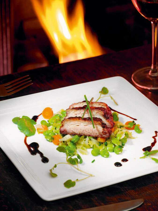 ИНГРЕДИЕНТЫ Лимон 4 штуки Свиная грудинка 1 кг Бобы фава 400 г Савойская капуста 400 г Сливочное масло 20 г Морковь 100 г Оливковое масло 20 мл Кленовый сироп 50 мл Белый винный уксус 50 мл Семена кориандра 1 чайная ложка Семена горчицы 1 чайная ложка Бальзамический уксус по вкусу Свежий розмарин 20 г Свежий тимьян 20 г Крупная морская соль 50 г ИНСТРУКЦИЯ ПРИГОТОВЛЕНИЯ 1. Толстую рыжую кожу с грудинки надо срезать — при термической обработке она превращается в предмет обувного дела, а не гастрономии.