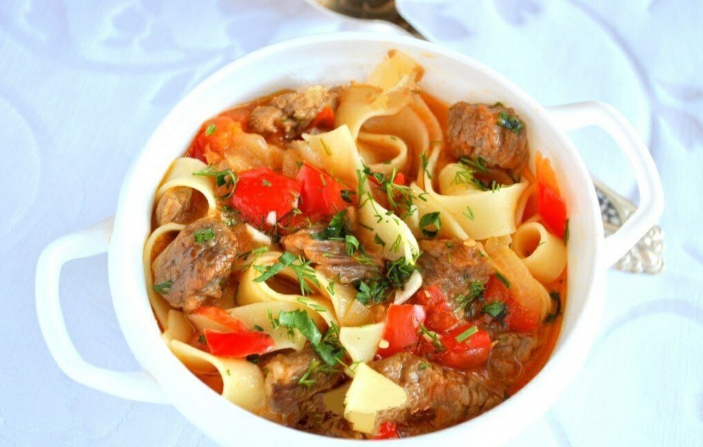 Лагман - популярное среднеазиатское национальное блюдо, а если точнее, то просто густой суп. Его главными составляющими являются мясо, лапша и овощи. Приготовьте обязательно, равнодушных не останется! Для приготовления вкуснейшего лагмана потребуется: Приготовление: 1. Перец, помидоры, лук очистить и нарезать кубиками. Мясо нарезать небольшими кубиками. 2. В глубокой сковороде сильно разогреть растительное масло. На сильном огне обжарить мясо (лучше порционно, чтобы мясо не тушилось, а жарилось). Затем готовое мясо выложить в тарелку. 3. Когда всё мясо готово, вернуть его в сковороду. Добавить овощи, жарить помешивая, 5-7 минут. 4. Затем влить теплый бульон, довести до кипения, уменьшить огонь до среднего и варить до готовности (около часа). 5. Петрушку и чеснок мелко порубить. За минут 10 до готовности мяса, отварите лапшу в соответствии с инструкцией на упаковке. Готовую лапшу откинуть на дуршлаг. В глубокие тарелки положить лапшу, влить суп, посыпать чесноком и петру