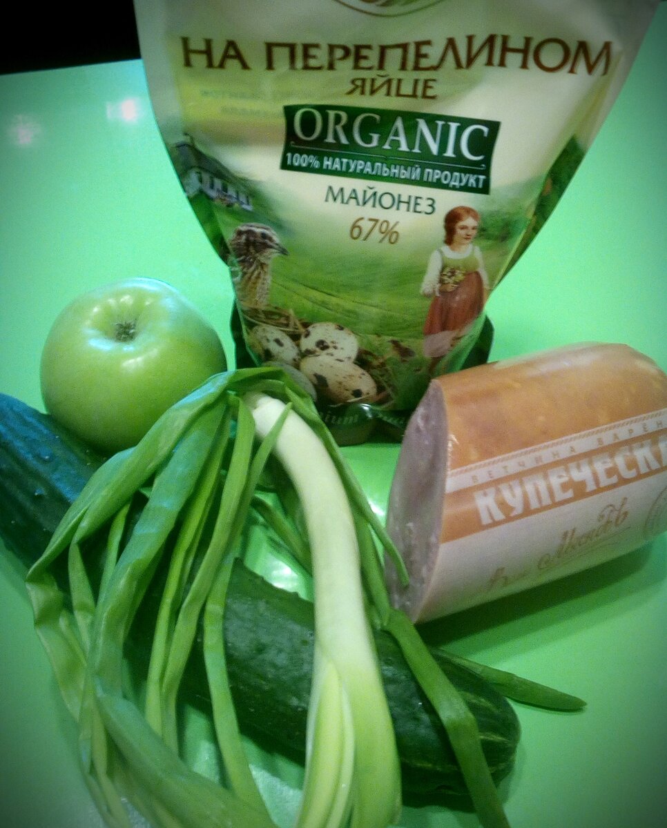 Приготовление 7 минут Время пошло! Салат на все случаи жизни: опробован на домашних, друзьях, подругах. Рассчитан на мужчин и женщин с разными предпочтениями. Прошел испытание временем. Ничего вареного, все свежее и майонез. Все ингредиенты берем в равных пропорциях на глаз. Огурец моем и нарезаем брусочками. Ветчину нарезаем соломкой. Перо зеленого лука моем и нарезаем как обычно. Половинку сладкого зеленого яблока натираем одновременно на крупной и мелкой терке. Все ингредиенты смешиваем, заправляем майонезом. Салат готов! Во сколько уложились по времени?