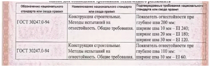 Фактический предел огнестойкости заделок (уплотнителей) из негорючего материала (герметики, монтажные пены, пасты, минеральная вата, шнуры базальтовые и др.) будет зависеть от глубины и ширины шва.