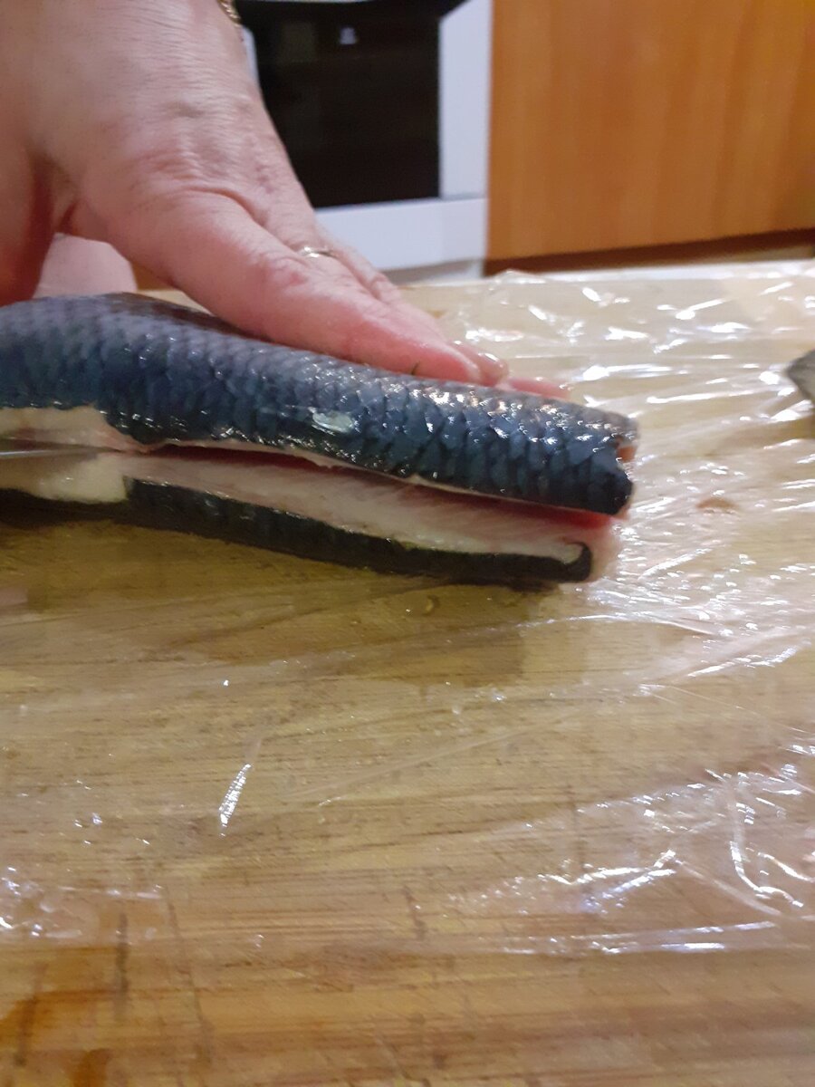 Затем её надо разделить: разрезать брюшко и очистить всё содержимое, убрать плавнички, надрезать всей длине спинки до самой кости. Освободить филе рыбы от центральной кости при помощи прижимания большого и указательного пальца, как бы отщипывая кость. С филе снять кожу (очень хорошо снимается) и разделить на порционные куски.
