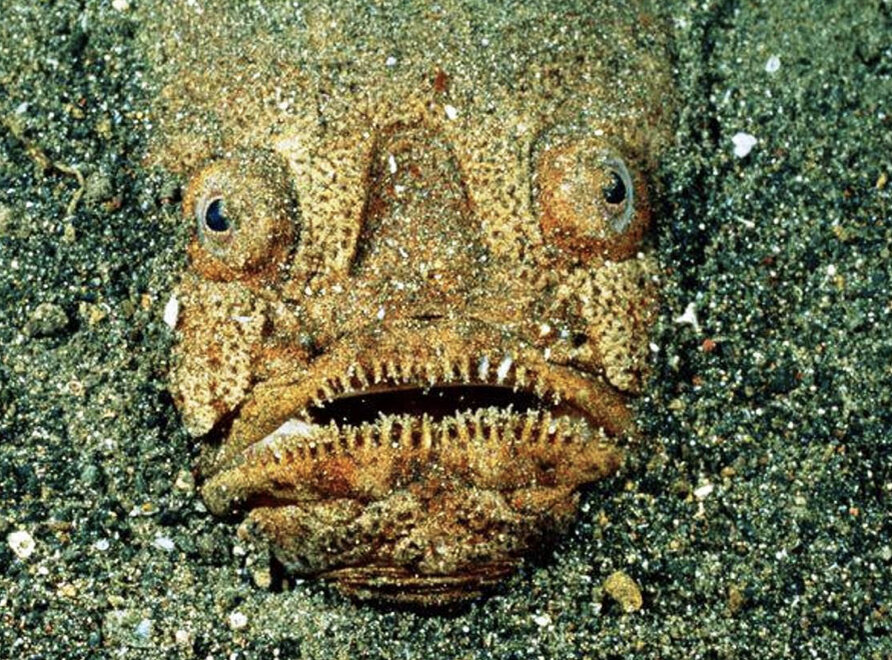 Рыба-звездочет Не дай бог вам разглядеть это загробное лицо среди морского дна! Рыба-звездочет может быть очень опасна для купальщика, поскольку обладает ядовитыми шипами над грудными плавниками позади жаберных крышек. Акула-гоблин Не самая крупная и жестокая, но уж точно самая страшная из акул. Обитает она у восточного побережья Австралии и в Юго-Восточной Азии. Самые крупные особи акулы-гоблина достигают почти 4 метров в длину и обладают несколькими рядами зубов, с помощью которых могут не только ловить рыбу, но и раскалывать панцири ракообразных. Адский кальмар-вампир Вампиром это существо прозвали за кроваво-красный окрас, а его отличительной чертой являются самые огромные во всем животном мире глаза (по соотношению к телу), которыми он улавливает то небольшое количество света, что проникает на глубину 600-900 метров. Зубатка полосатая Эти рыбы опасны своими острыми и мощными клыками, которыми они легко раскусывают панцири крабов и раковины моллюсков. Не зря скандинавы верили, что