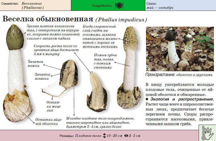 - Внешне молодая Весёлка обыкновенная напоминает яйцо овальной формы. Гриб не ядовид и съедобен в стадии яйца. С ростом тонкая оболочка его разрывается, и на поверхности можно увидеть шляпку будущего гриба. Ее вершина представляет собой плотный диск с отверстием в центре. После этого начинает стремительно расти ножка. Происходит это так быстро, что наблюдатель может прийти в восторг от увиденного.