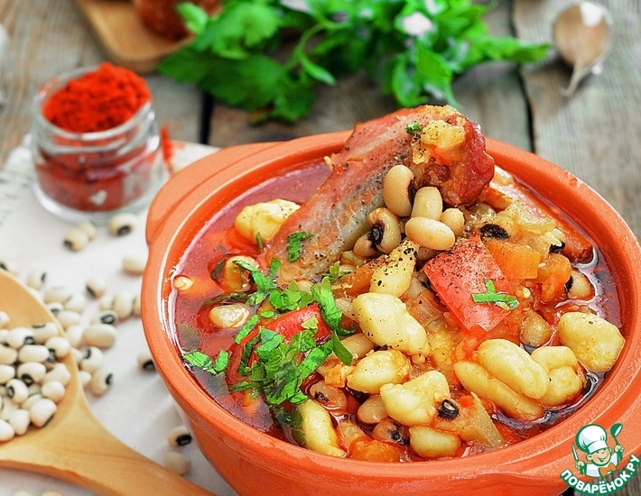 Венгерские густые супы занимают почётное место в мировой кулинарии. Ароматный, наваристый боб гуляш с несколькими видами мяса, фасолью, копчеными ребрышками и традиционными чипетке покоряет своим насыщенным вкусом. Он отлично подойдет для зимнего обеда. Боб гуляш настолько сытный и богатый на вкус, что готовить второе блюдо в этот день, просто не имеет смысла. Его одного хватит, чтобы заменить и первое и второе. У боб гуляша нет единого рецепта, каждая хозяйка готовит его по-своему. Кто-то берет смесь свинины и говядины, кто-то готовит с колбасками, кто-то с рёбрышками. Изначально его готовили в большом казане литров на 10-15, на костре. А сегодня мой вариант боб гуляша для приготовления дома. Ингредиенты для «Суп "Боб гуляш" по-закарпатски»: Бульон из свиной ножки Боб гуляш Чипетке Рецепт «Суп "Боб гуляш" по-закарпатски»: Для приготовления боб гуляша используйте любую белую фасоль. Я выбрала фасоль "Черный глаз" от Мистраль. Замочите её на ночь в воде и отварите до полуготовности (
