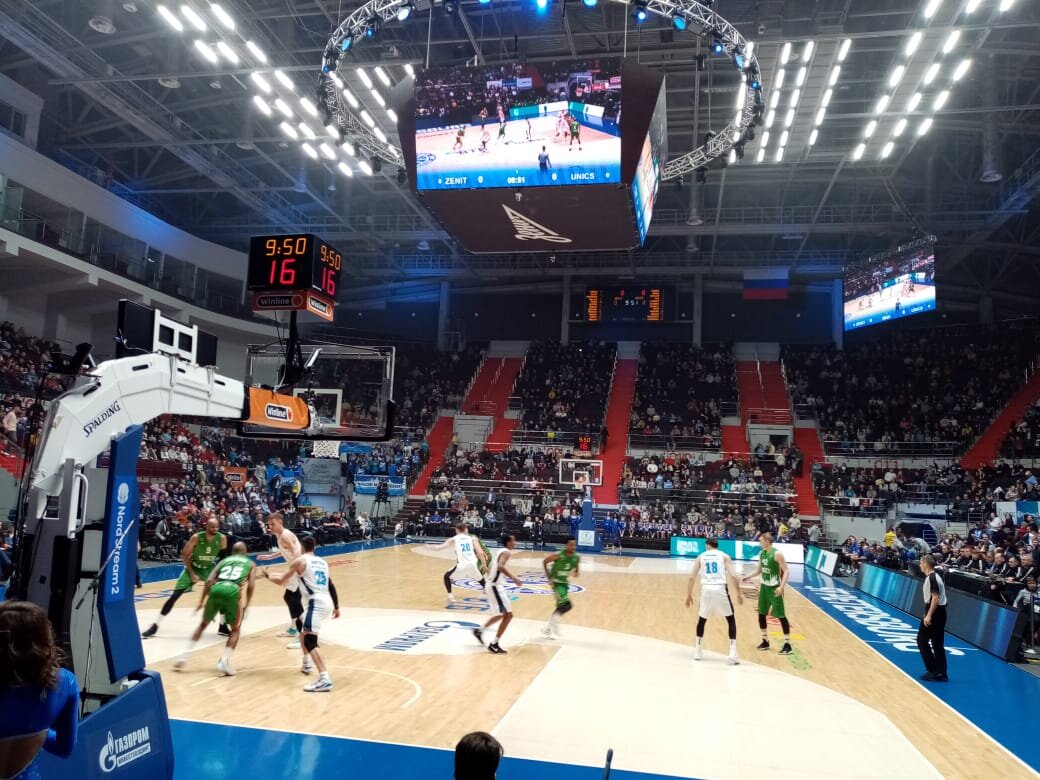 «СИБУР АРЕНЕ», мягко говоря, поразила своим величием. Вмещает она не намного больше семи тысяч зрителей, но такое ощущение, что трибуны уходят куда-то под потолок. И напомнила она мне турецкие дворцы спорта. А находится «СИБУР АРЕНА» аккурат за футбольной, а иногда и хоккейной, «Газпром Ареной». От метро «Новокрестовская» минут десять совсем неспешным шагом. И за полчаса до начала встрече на всех входах были приличные очереди. А ведь в этот день в Санкт-Петербурге играл ещё и СКА. Значит, у баскетбола есть свой зритель. И это очень приятно, как и прогулка вдоль Невы от метро до арены. Если, конечно, вам в лицо не бьёт то ли снег, то ли дождь. Кстати, полдня Санкт-Петербург заваливало снегом, а вечером он растаял, хотя точно помню, как бродил днём по щиколотку в снегу. Ну а зрителей на матче в итоге было почти четыре с половиной тысячи. И ещё одно. На одном из виражей на гранитной плите есть надпись в память о геройской обороне Ленинграда в годы Великой Отечественной Войны. С гвоздиками. А как раз на следующий день после матча вся России и Санкт-Петербург отмечали важную дату в своей истории – ровно 76 лет назад была снята блокада города. Пока есть память, будет жив подвиг. Здорово, что проекторы арены учли этот момент. А жители того самого Ленинграда получили овации и подарки от организаторов матча. Да, с такими соотечественниками мы непобедимы.