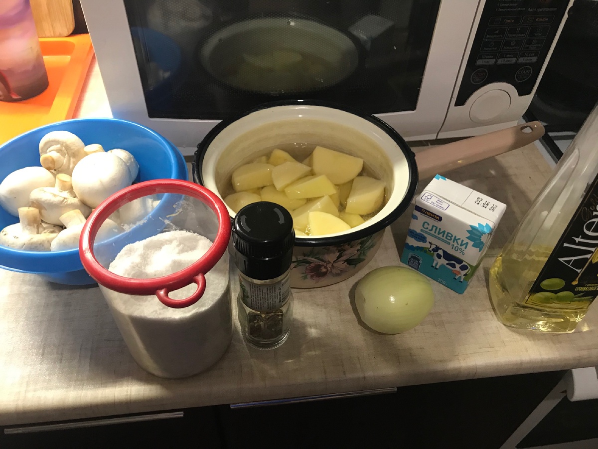 Сегодня я хочу поделиться с вами рецептом нежнейшего крем-супа из шампиньонов. Нам понадобится: 2.Картофель отвариваем в подсоленной воде. 3.После того как картофель сварился, воду сливаем и в кастрюлю добавляем обжаренные грибы с луком 4.Взбиваем блендером и постепенно добавляем сливки Ваш нежный крем-суп из шампиньонов готов. Украшаем зеленью и добавляем сухарей. Приятного аппетита!